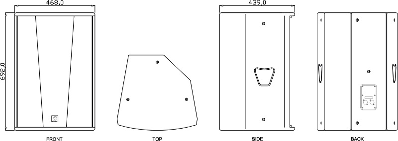 箱體外形 Physical 梯形 箱體材料 Enclosure Material 18/25厘厚樺木夾板 箱體網(wǎng)面 Enclosure Material 模壓鋼制圓形孔網(wǎng)面 表面漆 Finish 水性環(huán)保多層耐刮、耐腐蝕、防水油漆 吊裝點 Handing Position 14個M8吊掛螺絲孔位 支撐座 Pole Mount 底部一個Φ35mm支撐座 |
